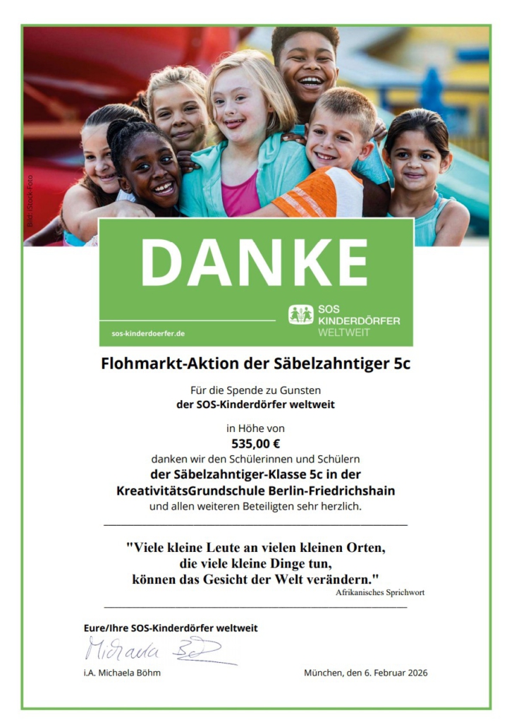 Unsere Säbelzahntiger der Kreativitätsgrundschule Friedrichshain haben sich im das Fach FreiDay mit dem Thema Armut beschäftigt und wollten anderen Kindern konkret helfen.